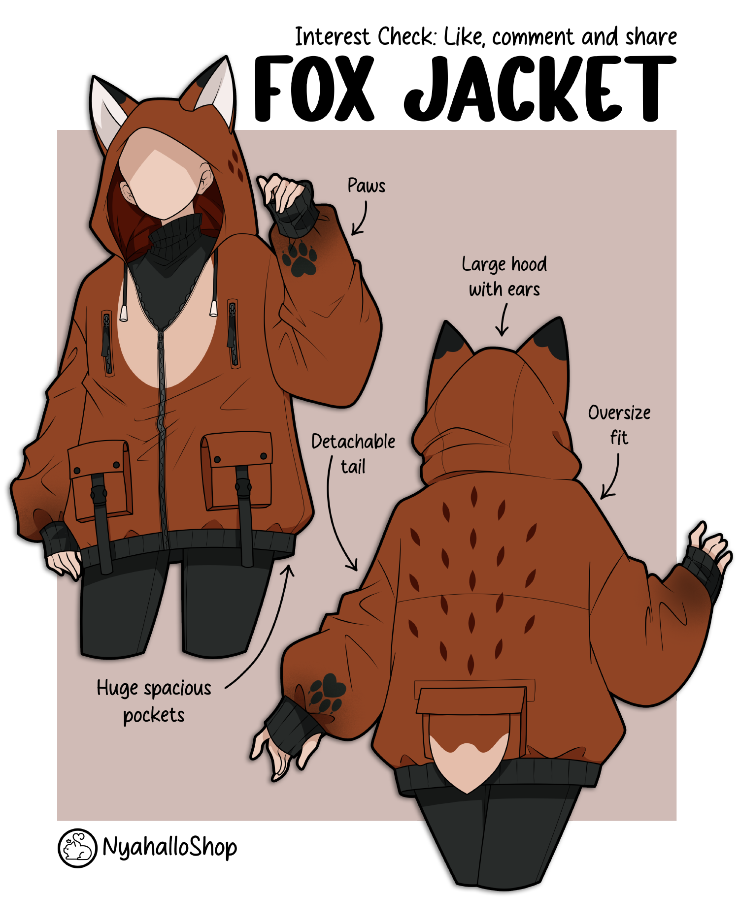 • Illustrated concept of an oversized unisex fox jacket with large hood, fox ears, detachable tail, paw-print sleeves, and spacious front pockets. Shown from front and back views.