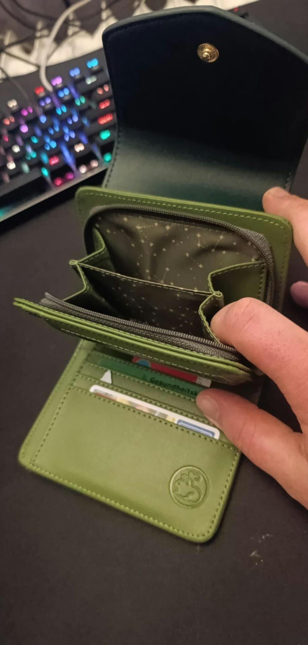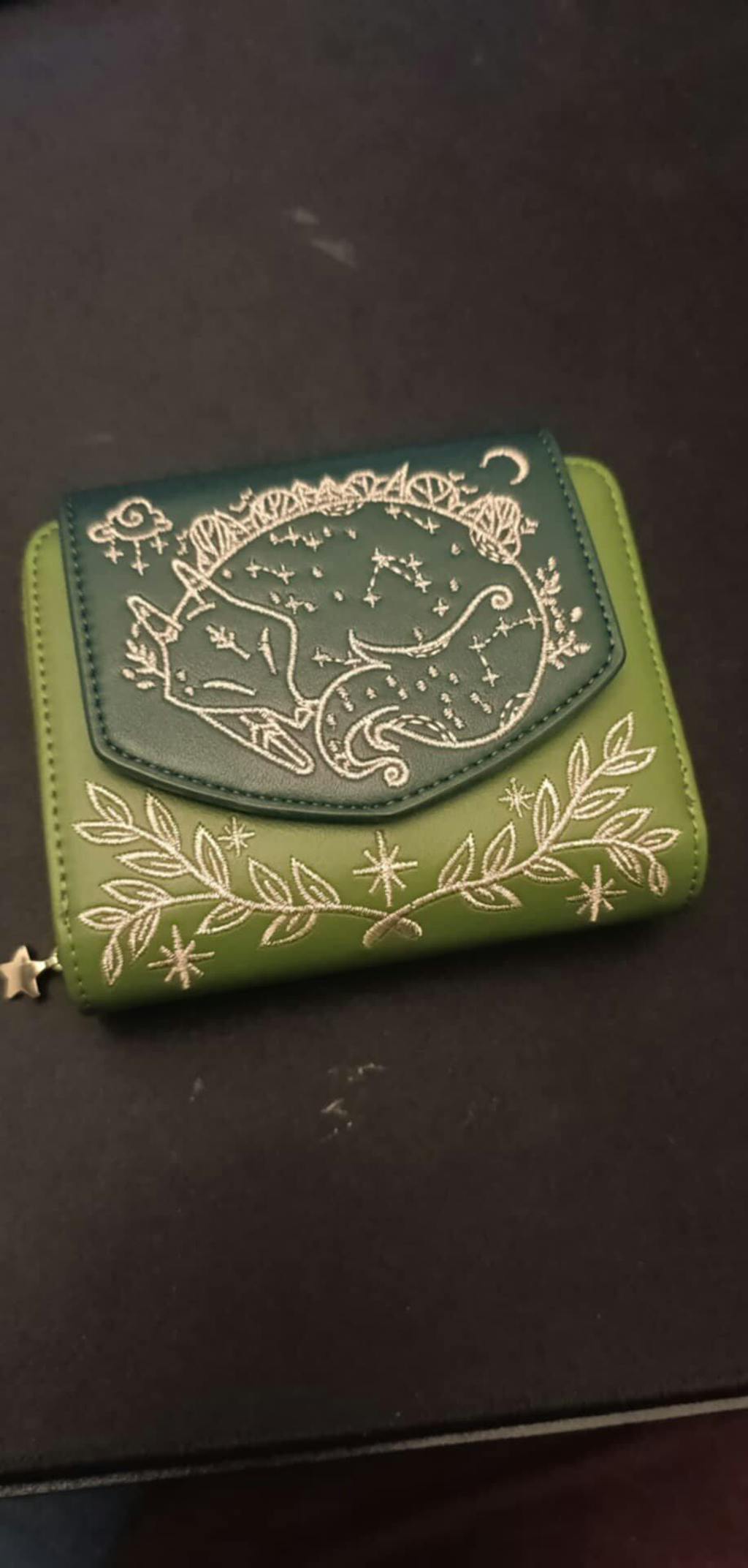 • Green faux leather wallet with rose gold embroidery of a sleeping fox, floral vines, stars, and constellations. Held outdoors in natural lighting.