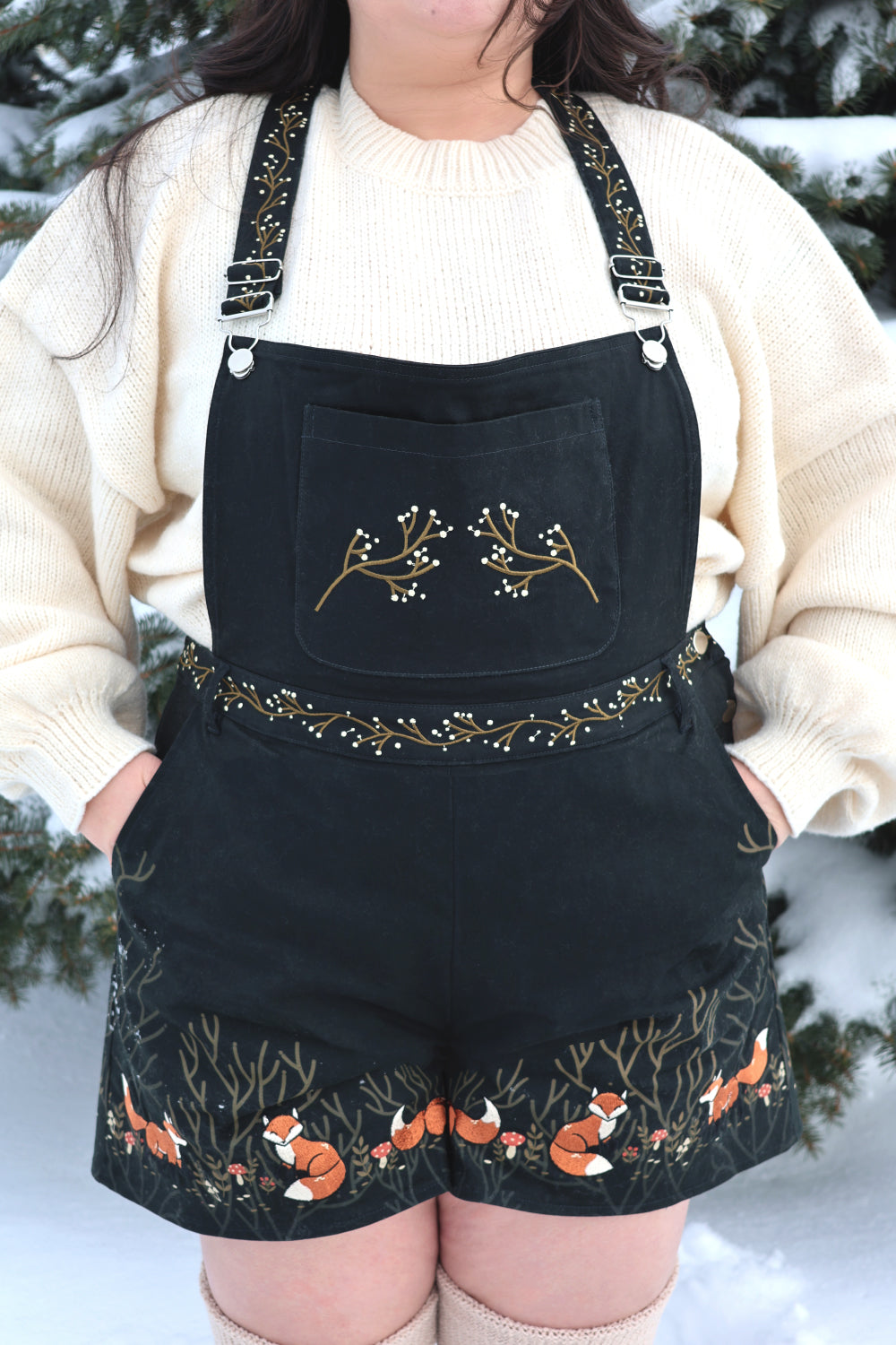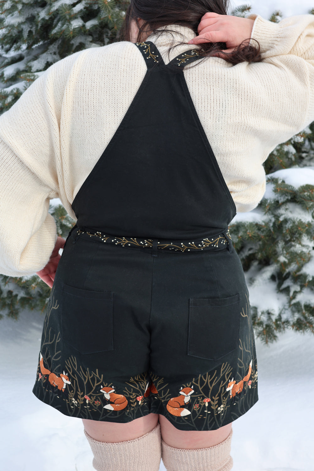 The Forest Tale Fox Overalls are crafted from thick, canvas-weight 100% cotton, designed to hold their structure while remaining comfortable for everyday wear. Deep forest hues create a storybook backdrop, featuring delicate fox illustrations, subtle nature-inspired details, and soft earthy tones along the hem.