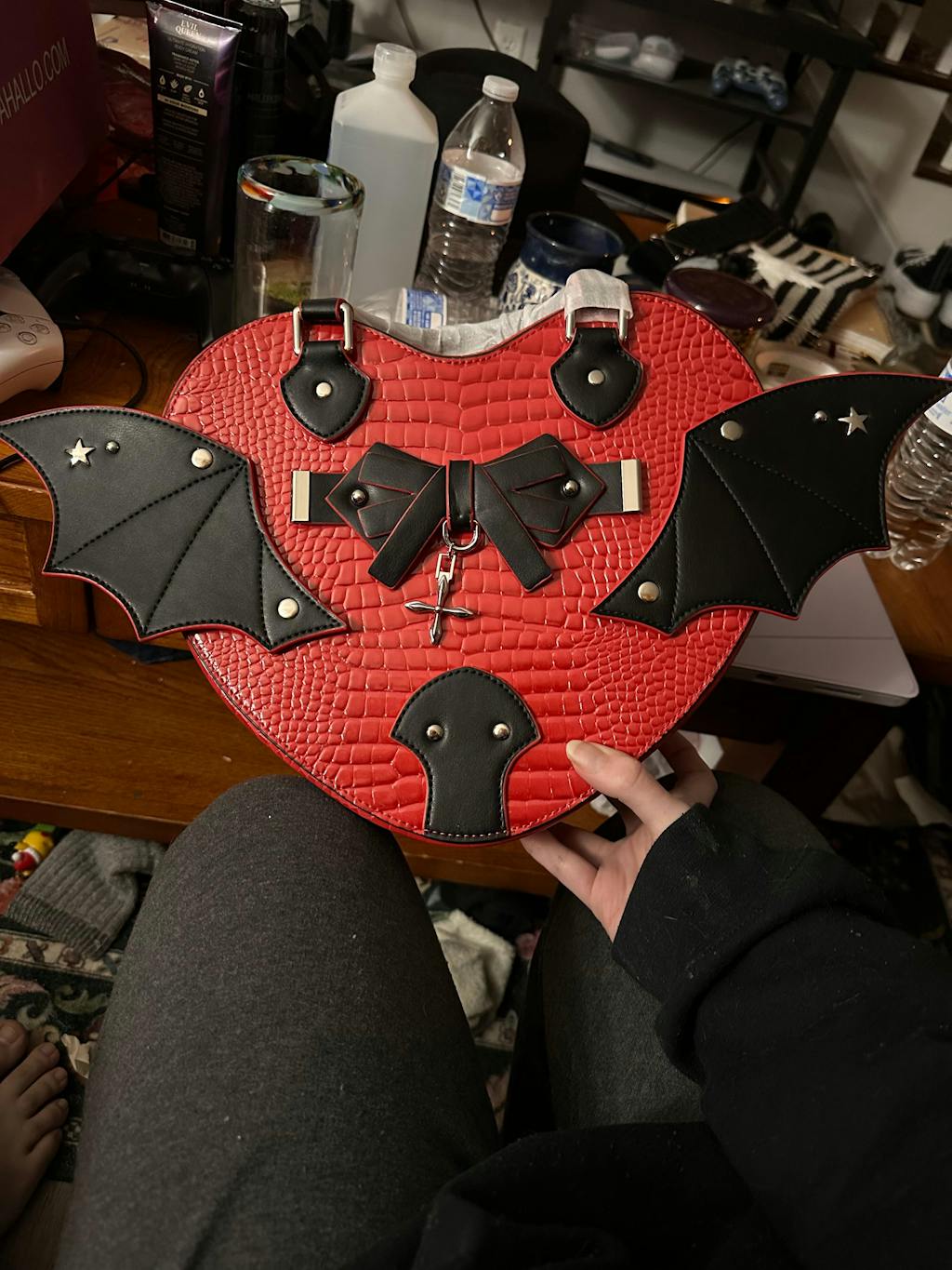 To all Queens out there, this one is for you! Queen of Hearts is a medium sized vampy and edgy heart bag which matches well with many coords, including gothic lolita style and punk alternative outfits. It combines red and black in a tasteful way which gives space to a lovely quilted surface which is soft to the touch, the most adorable heart and key accessories, crown zipper pulls, and easily opens by way of metallic button! The bag is conveniently and simply opened by zipper and has a metallic button over it. Don't worry the lock and key is just for aesthetic detail. It can carry most smaller iPads, your switch, wallet, and anything else you think of like lip gloss, hand creams, etc.